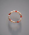 Anellino morbido, realizzato con un filo interno in nylon che si adatta delicatamente alla forma del dito. Le perle di fiume dialogano con coralli vintage, recuperati da antiche collane, intervallati da elementi in argento 925 dorato.