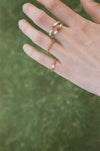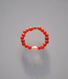 Anellino morbido, realizzato con un filo interno in nylon che si adatta delicatamente alla forma del dito. I coralli vintage, recuperati da antiche collane, sono impreziositi da una perlina di fiume centrale e chiusi da un elemento in argento dorato.